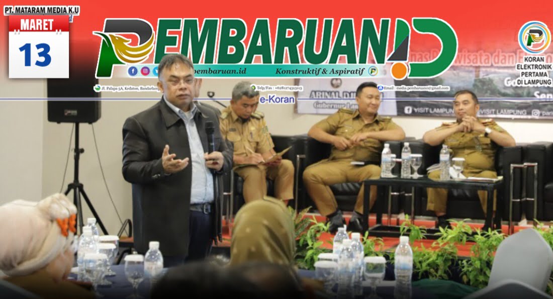 Musrenbang Parekraf se- Provinsi Lampung Tahun 2023, hadir secara langsung jajaran kepala dinas pariwisata provinsi, kabupaten dan kota se Provinsi Lampung serta beberapa asosiasi travel agency , perhotelan, dan wirausaha. Selain Dr Ayi, hadir pula narasumber lainnya yaitu Kepala Dinas Pariwisata Provinsi Lampung Bobby Irawan, Fungsional Bapedda Provinsi M. Zaimuddin Akbar, Kadisporapar Way Kanan Taufik Hidayat, dan Sekretaris BPD PHRI Lampung Friandi Indrawan. (rls/red)