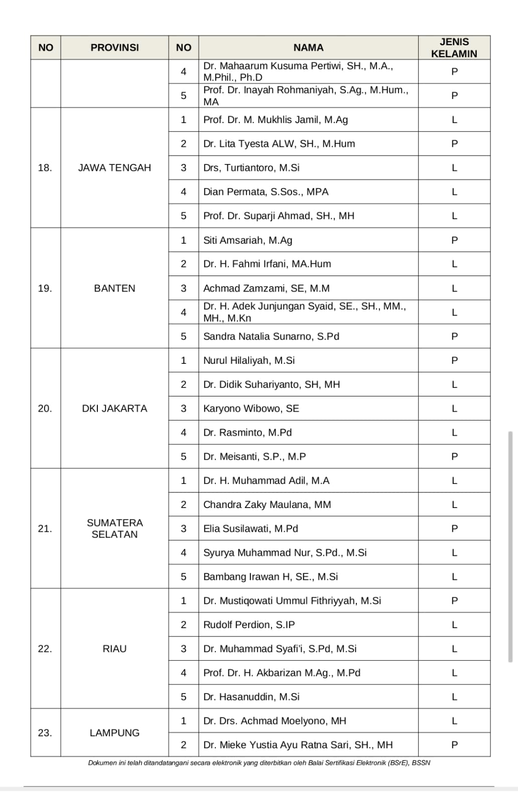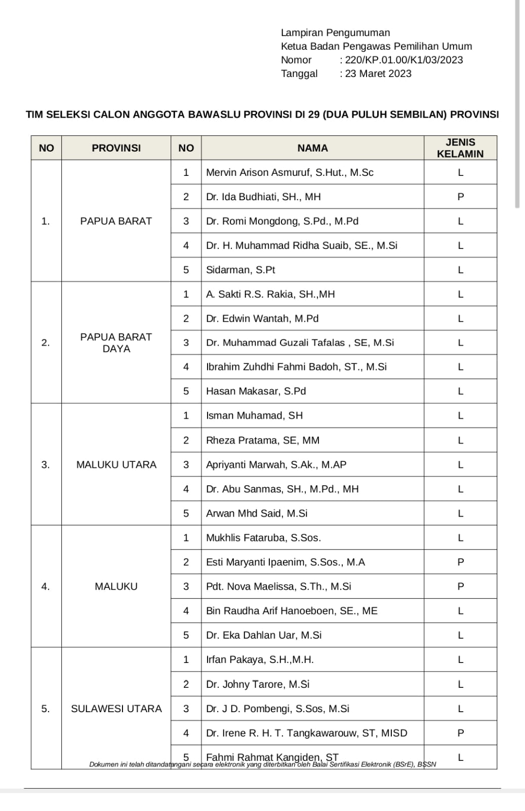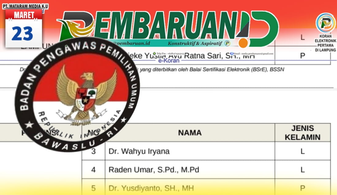 Dalam Pengumuman Nomor 220/KP.01.00/K1/03/2023 tentang Pembentukan Tim Seleksi Calon Anggota Badan Pengawas Pemilu Provinsi di 29 Provinsi periode 2023-2028 itu, terdapat lima nama Timsel Bawaslu Lampung, yakni: