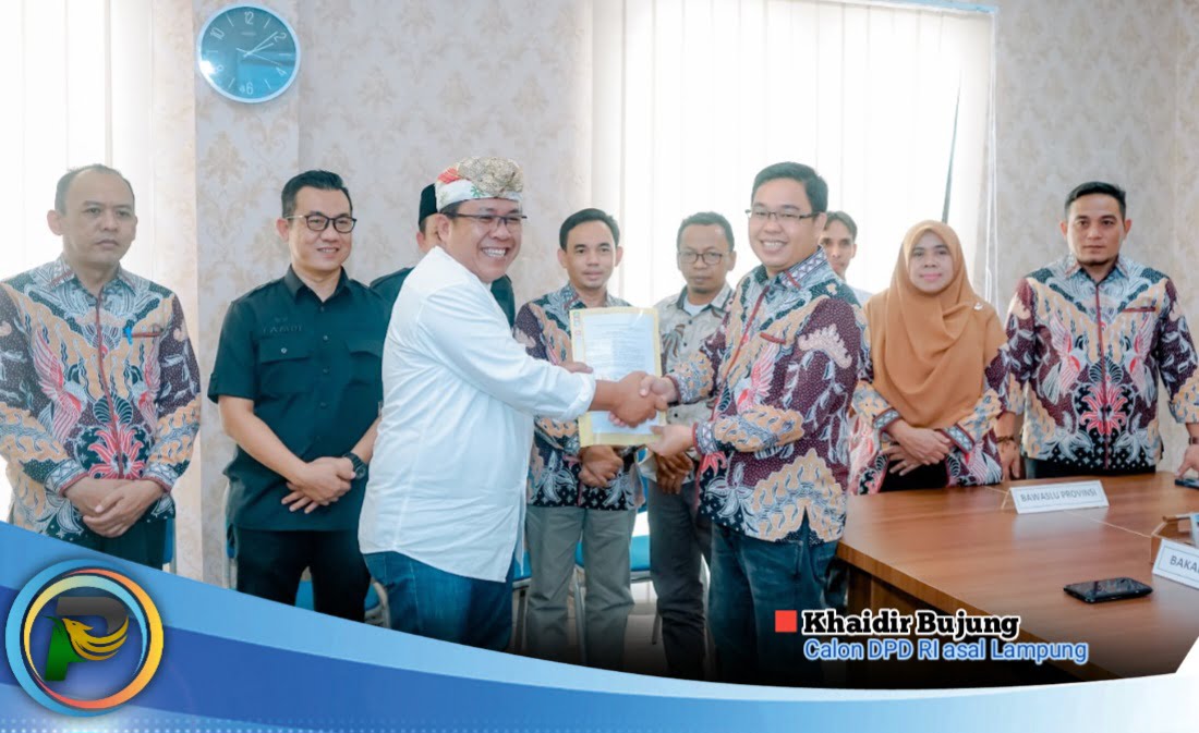 Bujung kemudian menyerahkan berkas pendaftaran model B yang diterima langsung oleh Ketua KPU Provinsi Lampung, Erwan Bustami serta disaksikan anggota KPU dan Bawaslu Provinsi Lampung.