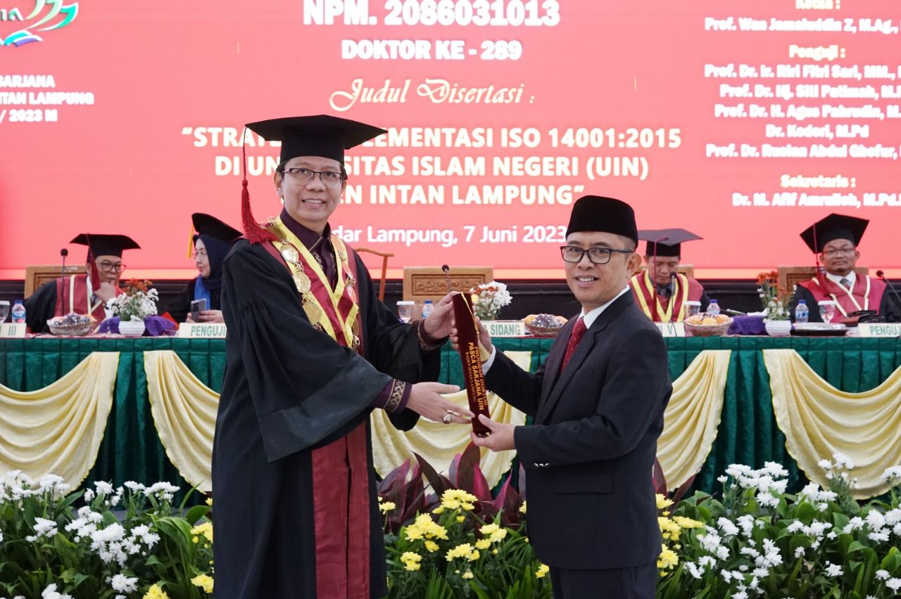 Rektor Prof Wan mengucapkan selamat kepada promovendus atas diraihnya gelar Doktor yang ke 289 Program Pascasarjana UIN Raden Intan Lampung dengan predikat Cumlaude dan menjadi salah satu Doktor yang bukan hanya berbasis riset tetapi juga terdapat implementasi di lapangan.